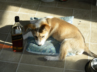Our friend J. was in Arizona, shadowing a vet at the Humane Society. J is in vet school. She called me up and asked, "hey - do you want a three-legged puppy?" I gave the appropriate answer....."Maybe.....". So, after a lot of details, J flew to Saint Paul with the puppy, and then we drove J back to Madison. I realize that there are puppies to be adopted here in the Twin Cities, but this just happened. I promised everyone pictures and updates of the little Whiskey girl, especially J and her parents, who fostered her for a week and became very attached to her.